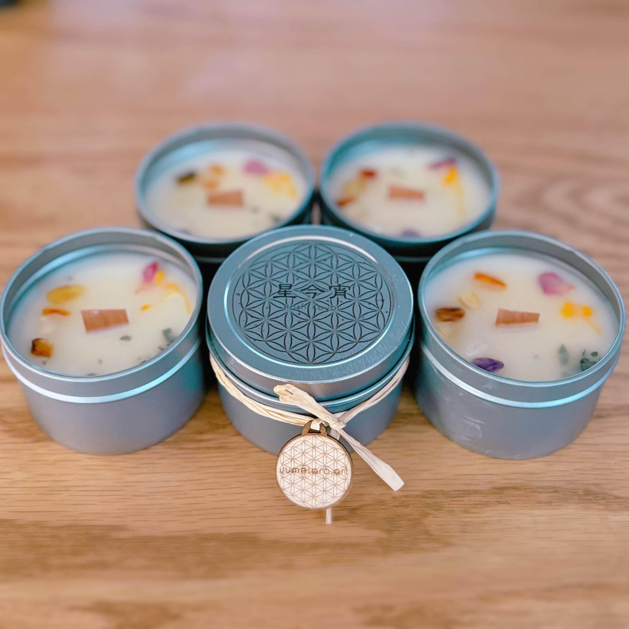 フタには神聖幾何学「フラワーオブライフ」を刻み、宇宙の調和を象徴する紋様が、キャンドルの浄化と癒しのエネルギーをそっと広げていくよう思いを込めました。